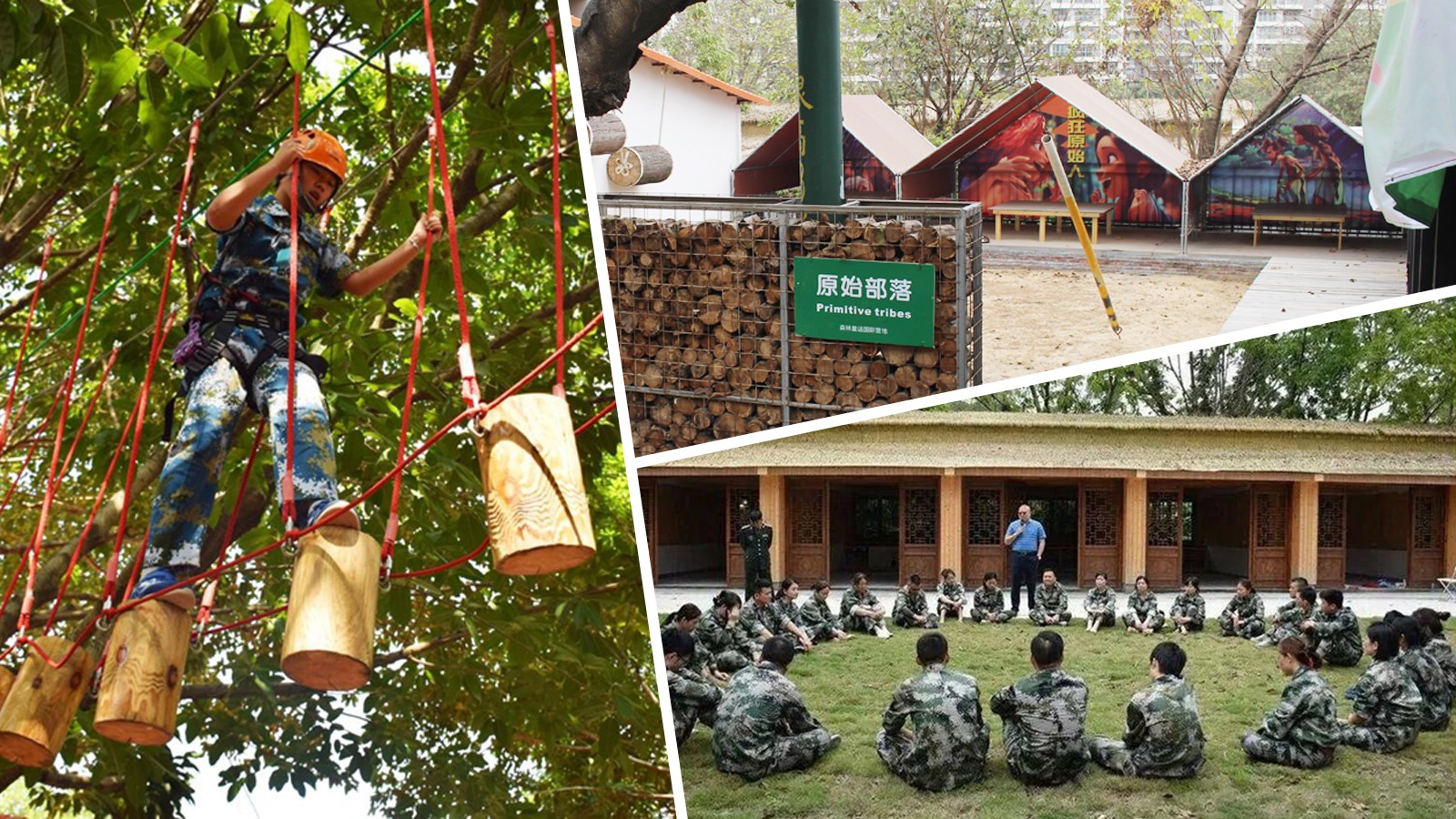 森林童話體驗營最大的閱兵訓練場約3000多平米,1個標準主席臺,能同時容納1000人開展訓練和活動;還擁有5個小型的訓練場地,多個小團隊展開拓展活動,也可以互不干擾,另外設計建造了大型畢業墻以及叢林穿越等高空活動項目設施。