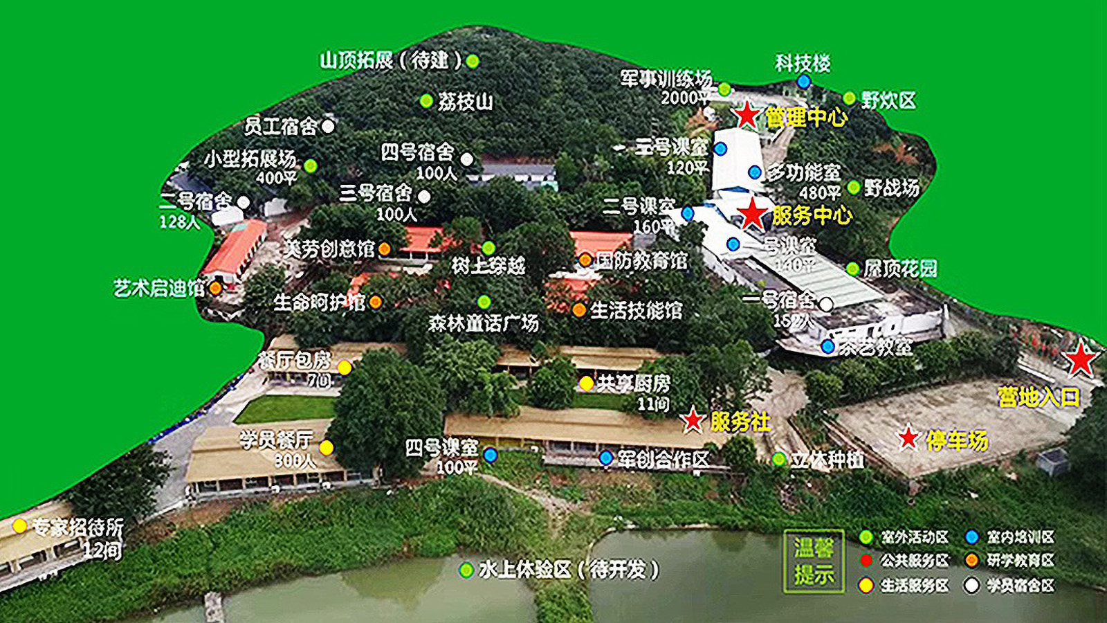 森林童話國際營地主要為企業員工軍訓、拓展訓練、會務活動,學生研學,親子活動,冬夏令營等提供場地和培訓服務。上下床鋪500多個床位,湖光山色專家招待所14個房間,餐廳可同時500人同時就餐,4個100-150人會議室,1個400-500人會議室,1個3000平方米帶閱兵臺的訓練場和多片小型訓練場,還有一座40多畝的荔枝山,距離深圳市區40分鐘左右車程,也是深圳周邊最近最美最原生態的自然營地。